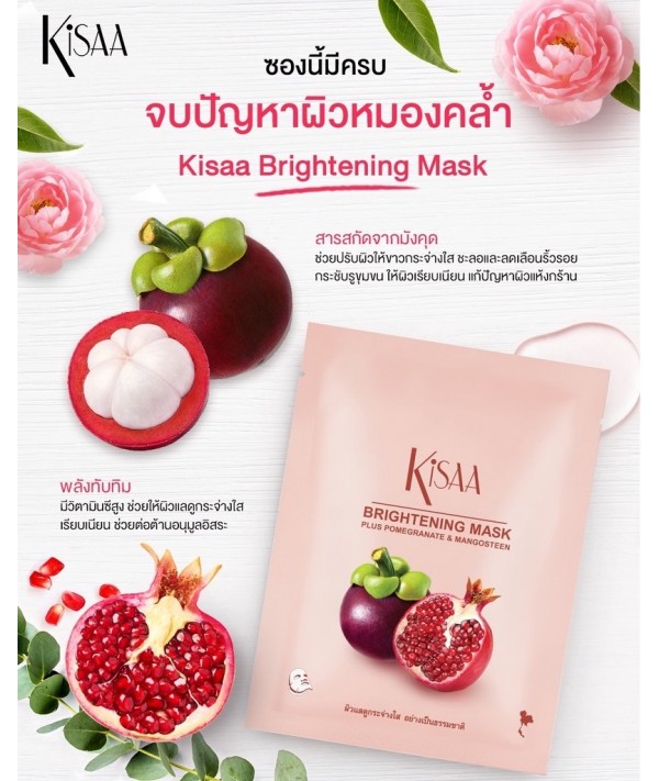 Kisaa Brightening Mask มาส์กหน้า สารสกัดจาก ทับทิม มังคุดและดอกกุหลาบบัลแกเรีย มาส์กบำรุงหน้าเข้มข้นผสมผสานกับ Booster ที่มีคุณสมบัติปรับสภาพผิวเพื่อเตรียมพร้อมรับการบำรุงจากสารสกัดในแผ่นมาส์ก ซึ่งอุดมไปด้วยสารสกัดจากธรรมชาติทั้งผลไม้และดอกไม้ที่ช่วยให้ผิวแลดูกระจ่างใส เรียบเนียน ลดจุดด่างดำบนใบหน้า พร้อมทั้งกักเก็บความชุ่มชื้นได้อย่างยาวนาน ให้ความรู้สึกเปรียบเสมือนทาครีมบำรุงบนผิวหน้า คุณสมบัติ : - ช่วยปรับสีผิวให้ขาวกระจ่างใส ชะลอและลดเลือนริ้วรอย กระชับรูขุมขน ให้ผิวเรียบเนียน แก้ปัญหาผิวแห้งกร้าน - ทำให้ผิวพรรณสดใส เปล่งปลั่ง - ช่วยต้านอนุมูลอิสระ ทำให้ผิวพรรณเปล่งปลั่ง เนียนใส ไร้ริ้วรอย - ช่วยปกป้องผิวจากแสงแดด
