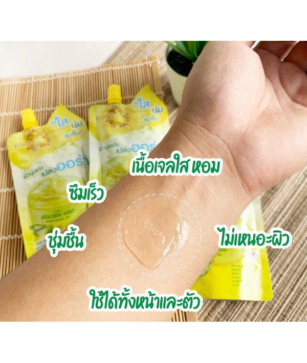 เจลกีวี่สีทอง เจลบำรุงผิวด้วยนวัตกรรม Light Touch เนื้อเจลเข้มข้น บางเบา นุ่มละมุน ซึมซาบเร็ว ไม่เหนียวเหนอะหนะ ให้ผิวแลดูอ่อนเยาว์ มีชีวิตชีวา ด้วยพลังจากสุดยอดสารสกัดกีวี่สีทองที่ช่วยเผยผิวที่แลดูกระจ่างใส รอยสิว จุดด่างดำแลดูจางลง พร้อมปกป้องผิวจากริ้วรอยให้ผิวแลดูอ่อนเยาว์ และสารสกัดว่านหางจระเข้เข้มข้น 99.99%* ที่ช่วยฟื้นบำรุงเติมความชุ่มชื้นให้กับผิว พร้อมทั้งช่วยสร้างเกราะปกป้องการขาดน้ำ ทำให้ผิวกลับมาเนียนนุ่มชุ่มชื้น คืนความสดชื่นแก่ผิว ฟื้นบำรุงผิวจากการระคายเคือง ผสานคุณค่า ด้วยส่วนผสมของสารสกัดอื่นๆ ได้แก่ Multi-HYA (ไฮยาลูโรนิค แอซิด 8 ชนิด), Nano-Bright (กลูตาไธโอน, อาร์บูติน, วิตามินซี), คอลลาเจน, วิตามินอี ช่วยฟื้นบำรุงผิวจากความแห้งกร้านให้ผิวกลับมาชุ่มชื้น พร้อมมอบผิวให้แลดูสว่างกระจ่างใส อิ่มน้ำ นำมาซึ่งผิวสวยและน่าสัมผัส เผยผิวใสออร่